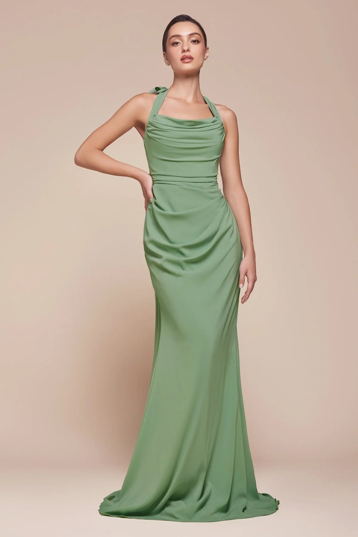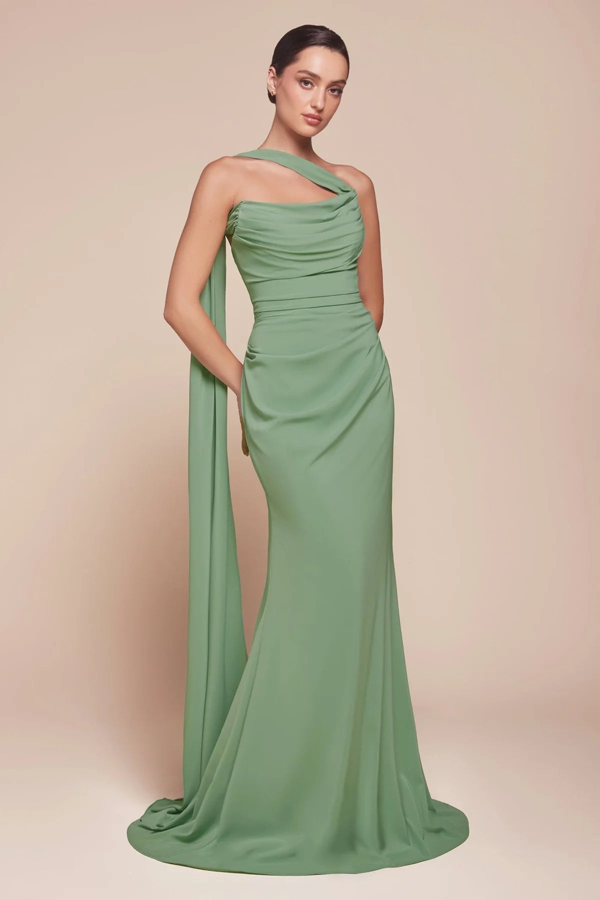 This strapless fitted gown features a scoop neckline and a gathered bodice, with elegant transitional ties under the arm for a unique touch. Crafted from soft chiffon, the structured bodice provides enhanced support for a flattering silhouette. Perfect for bridesmaids, wedding guests, or black-tie events, this dress exudes sophistication and charm.