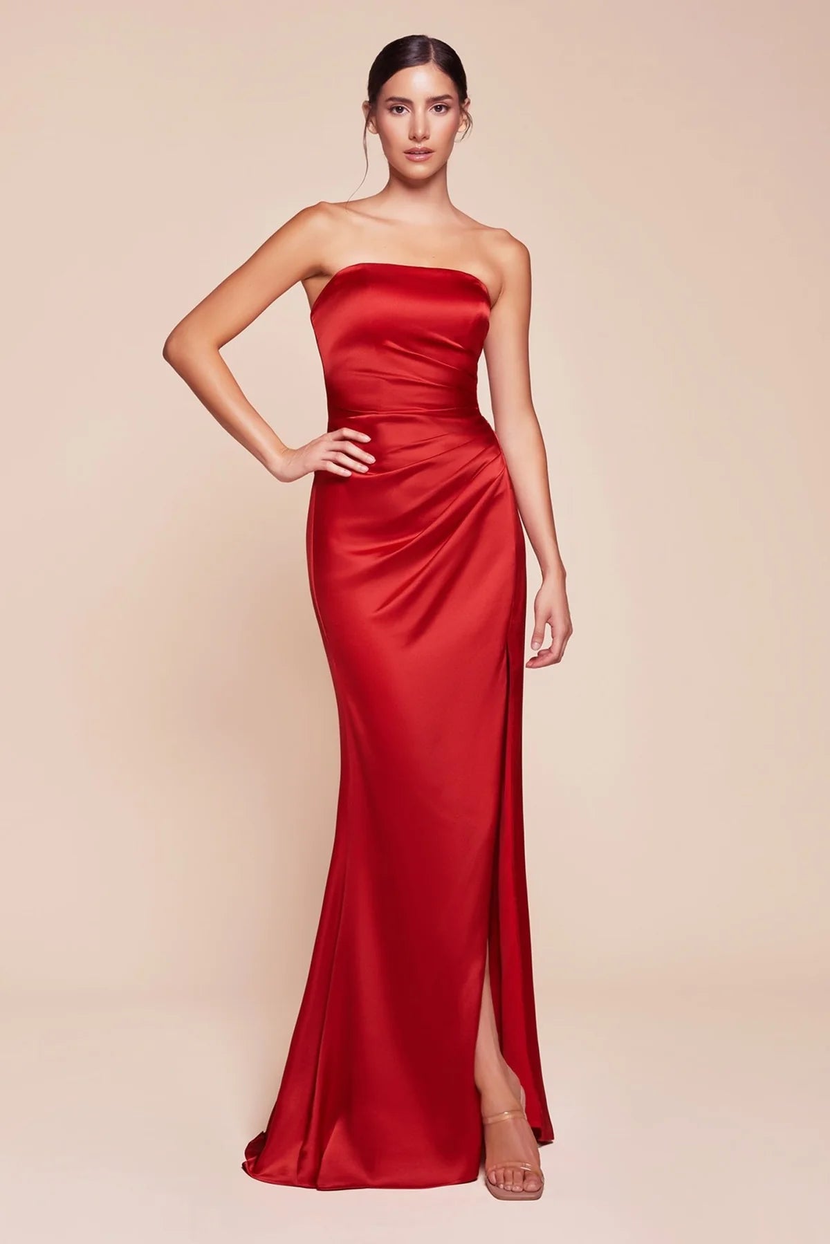 This fitted strapless gown, crafted from luxe satin, features a sleek straight neckline, gathered waistline, and elegant leg slit. Its form-fitting bodice with a lace-up corset back provides a perfect blend of support and sophistication. Ideal for bridesmaids, wedding guests, or any formal event, this dress offers timeless elegance.