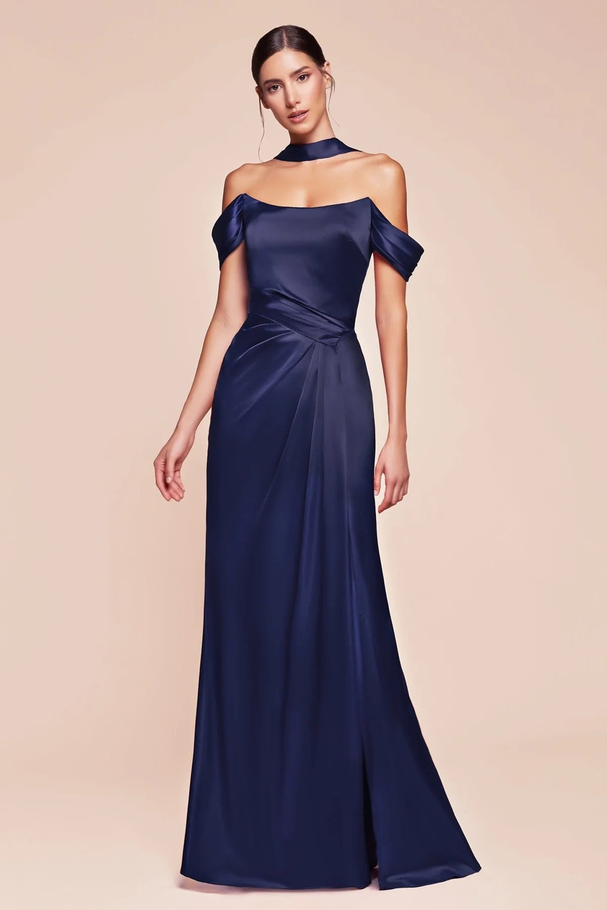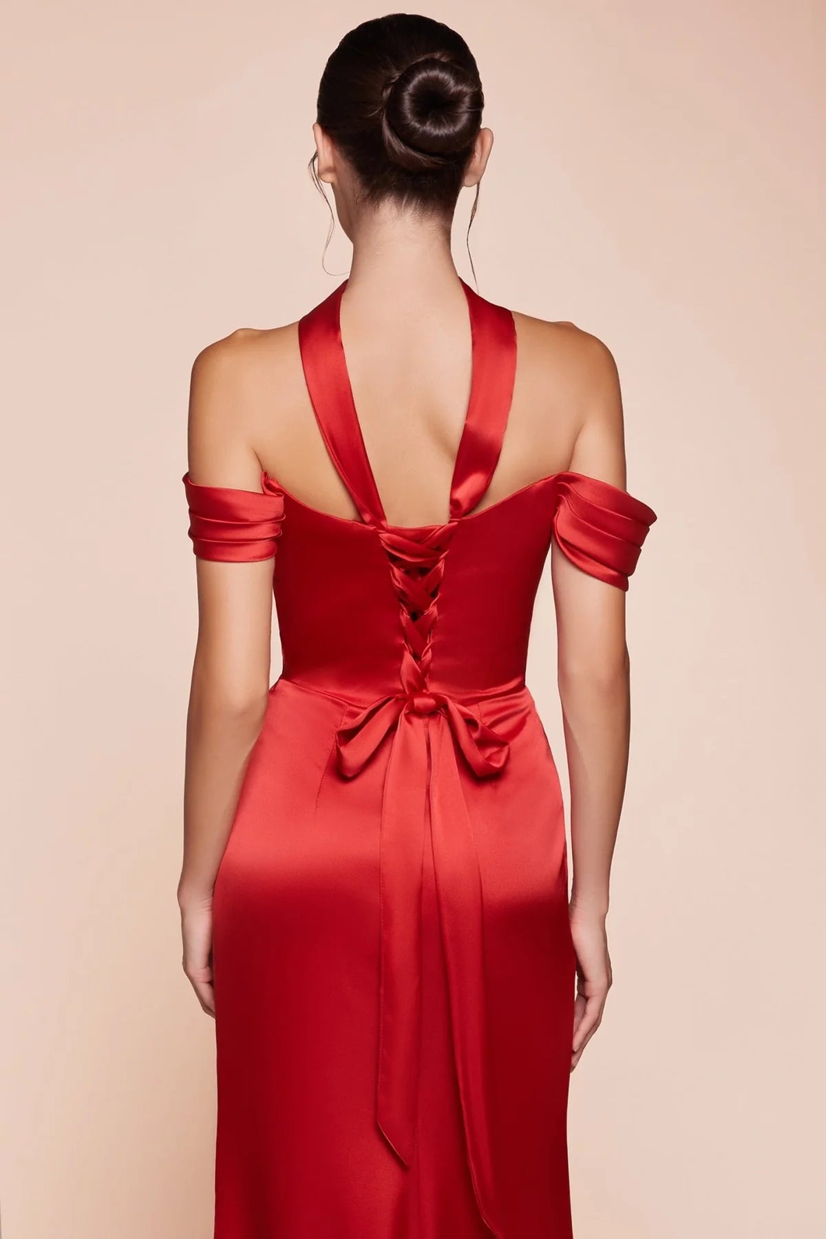 This fitted gown features a sweetheart off-the-shoulder design with a gathered hipline and elegant leg slit, crafted from luxe satin. The structured boned bodice provides support, while the lace-up corset back can also wrap around the neck for a unique touch. Perfect for bridesmaids, wedding guests, or formal events, this dress offers both sophistication and allure.