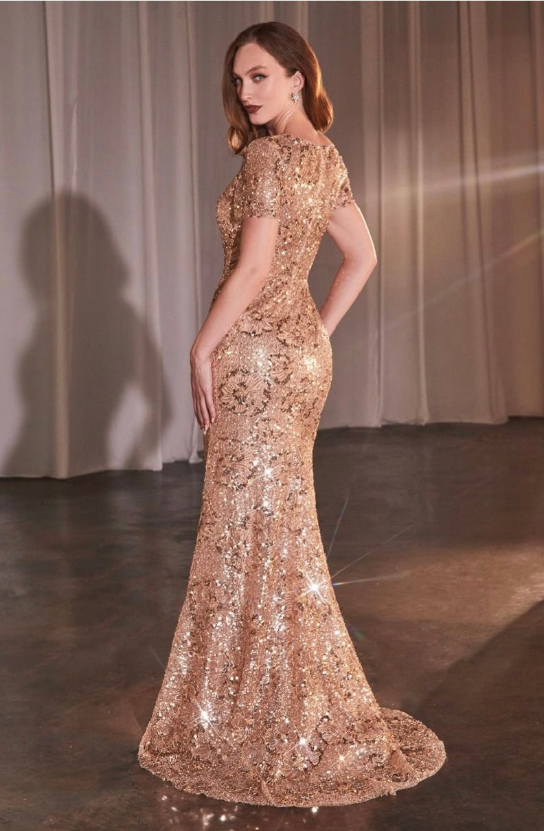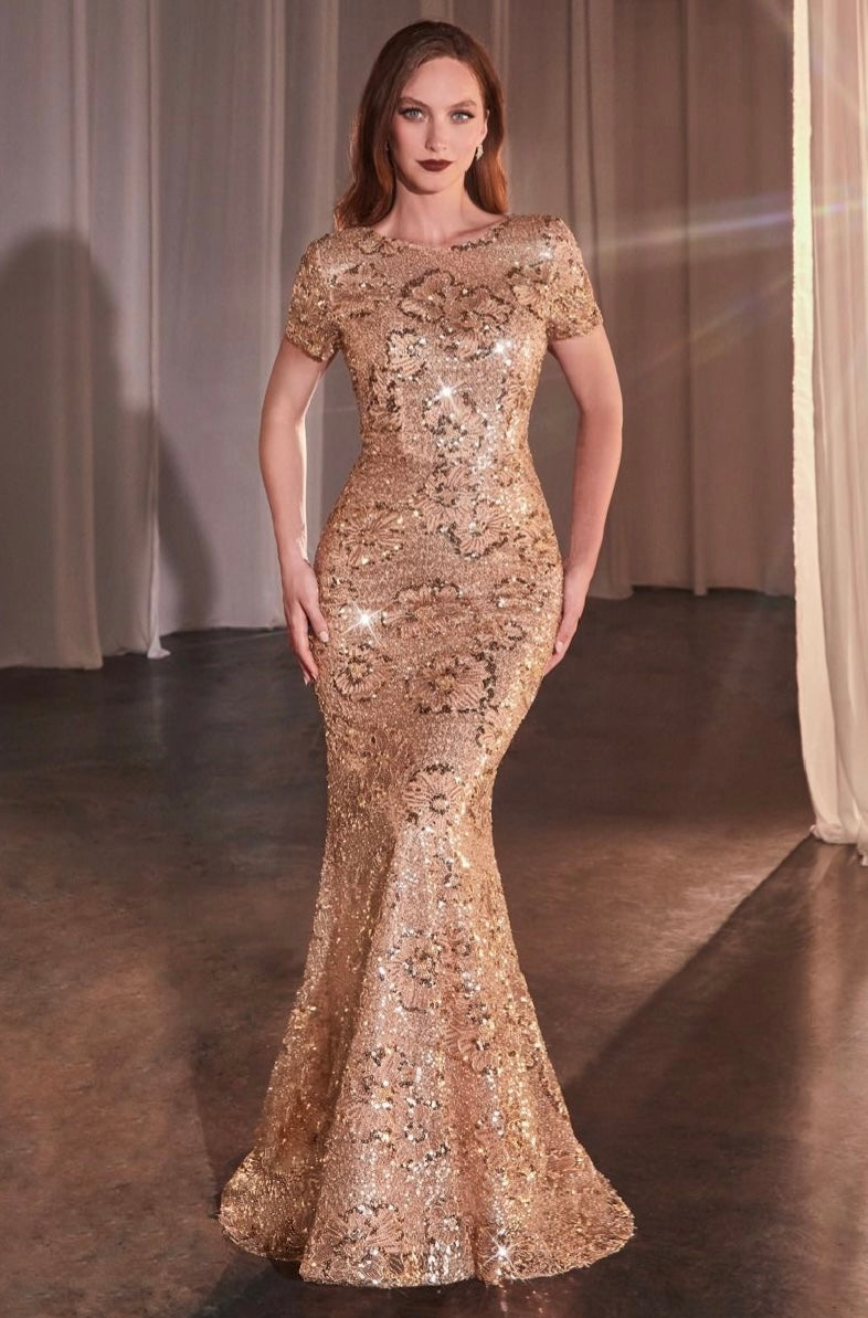 Effortlessly stylish and sophisticated, our fitted long dress features a high neckline and short sleeves. The intricate sequins and floral motif add a touch of elegance, making it the perfect choice for mother of the bride or formal evening events. Feel confident and beautiful in this must-have dress.