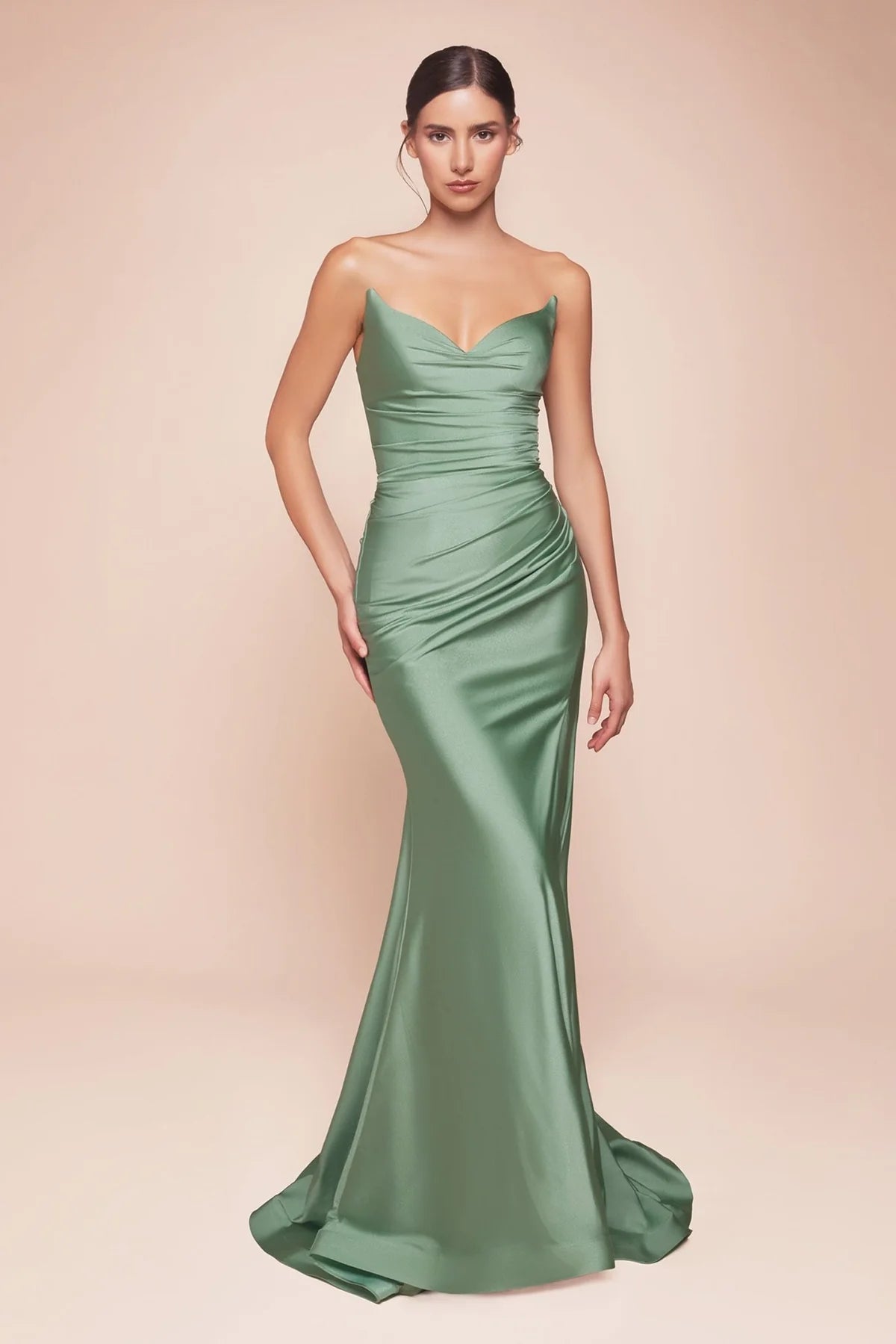 This fitted dress features a strapless pointed V-neckline, gathered waistline, and a chic leg slit for an elegant silhouette. Made from stretch spandex satin, it offers a perfect fit with a lace-up corset back closure. Ideal for bridesmaids, wedding guests, and formal events, this dress exudes sophistication.